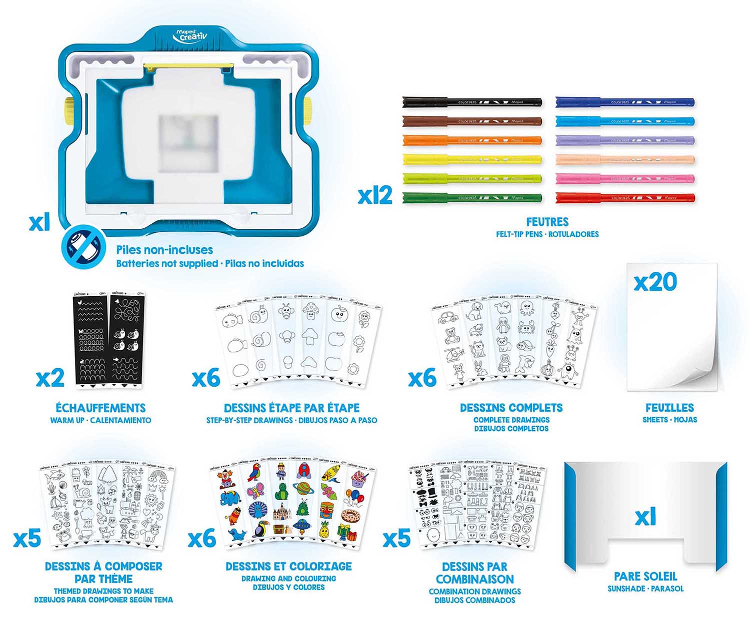 The Maped Creativ Lumi’Board is a portable drawing station that makes it super easy for children to quickly draw fun scenes via tracing! Set includes 30 tracing films that can be fed into the drawing station – turn on the integrated LED light, insert the tracing film you want and it is automatically projected onto your paper! The Innovative tracing & drawing studio is perfect for young children learning to draw. Travel-friendly design stores paper, tracing films and markers under the hinged tracing plate so it’s perfect for use on the go! Set includes 1 Lumi’Board, 12 Color’Peps Fine Tip Washable Markers, 30 Tracing Films, 20 Pieces of Paper and a Sun Shade. Requires AA batteries, which are not included. For ages 4-7. Dimensions: 4.1” x 15.6” x 12”