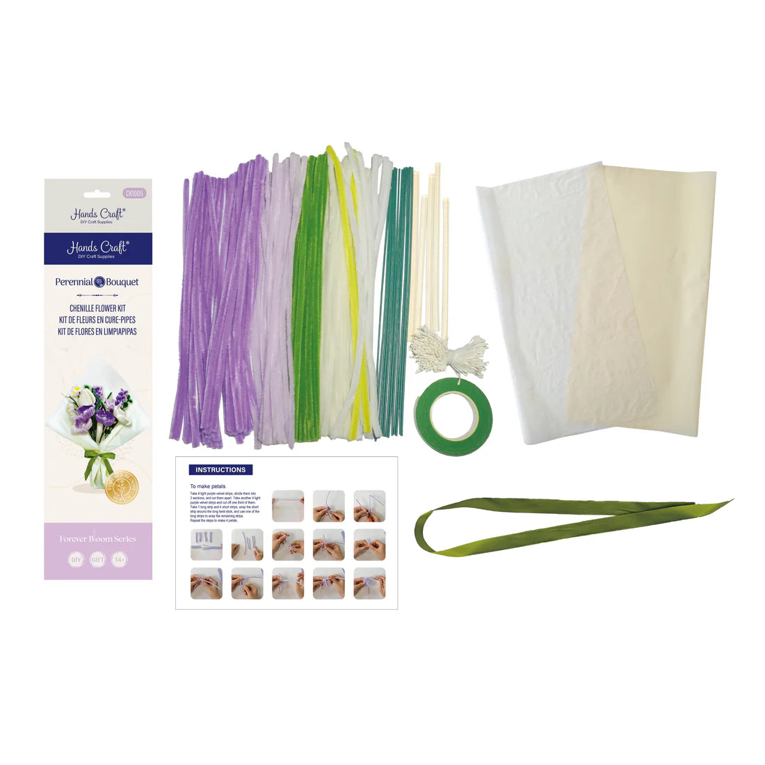 Soft, whimsical, and creatively calming - this DIY kit includes everything you need to twist, shape, and craft a stunning arrangement of purple chenille blooms.