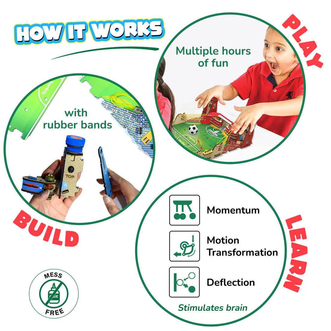 Build your very own mini soccer stadium at home that’s sure to become your child's new favourite play toy. Based on the scientific concepts of momentum, deflection and motion transfer, this DIY STEM-based toy teaches kids engineering and motor skills.