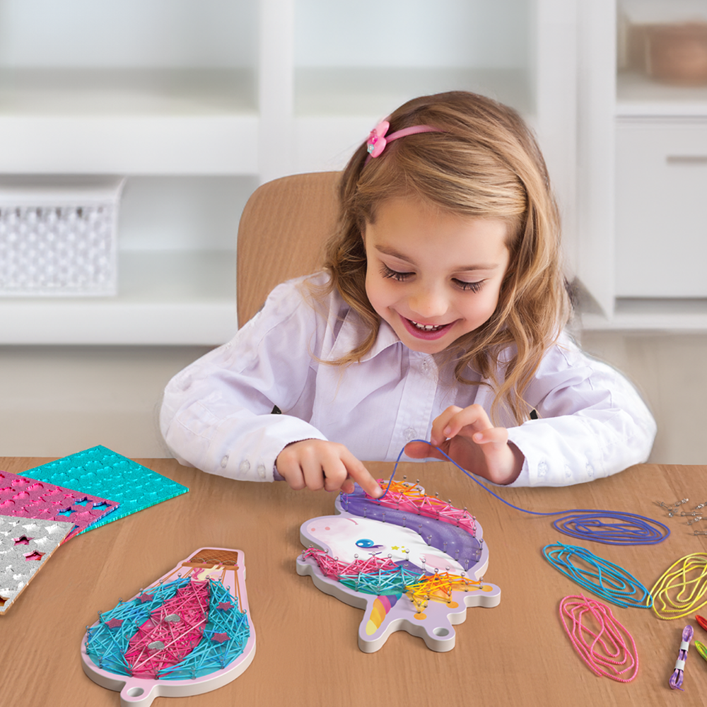 Snap in the pins and wrap colorful strings to create dazzling designs—no glue, no mess!