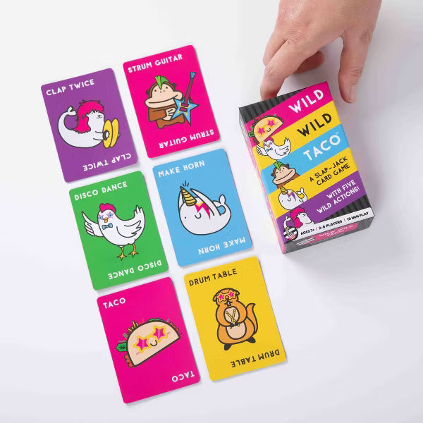 Ready for some wildly hilarious fun? Meet Wild, Wild Taco, the slap-jack card game from the makers of Taco Cat Goat Cheese Pizza. With all your favorite action cards and brand-new characters Seal and Disco Chicken, this game takes everything you love about Taco Cat Goat Cheese Pizza and cranks up the fun! Perfect for ages 7 and up and a quick 10-minute playtime so you can squeeze in some fun any time!